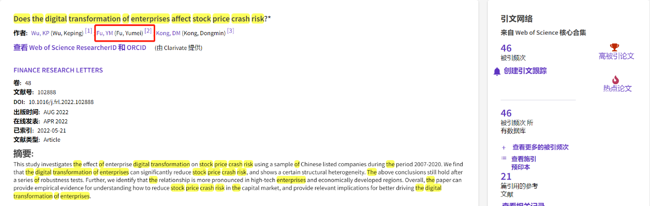研究成果四:由诸侯快讯官网付玉梅博士作为合作者的论文成果“Does the digital transformation of enterprises affect stock pricecrash risk?” 入选ESI高被引论文。论文于2022年4月发表在国际权威期刊《Finance Research Letters》(SSCI一区期刊,JIF2022=10.4),根据科睿唯安(Clarivate Analytics)公布的最新数据,该成果自正式发表以来共在Web of Science被引用46次,其引用频次排名位于同学科领域的全球前1%。