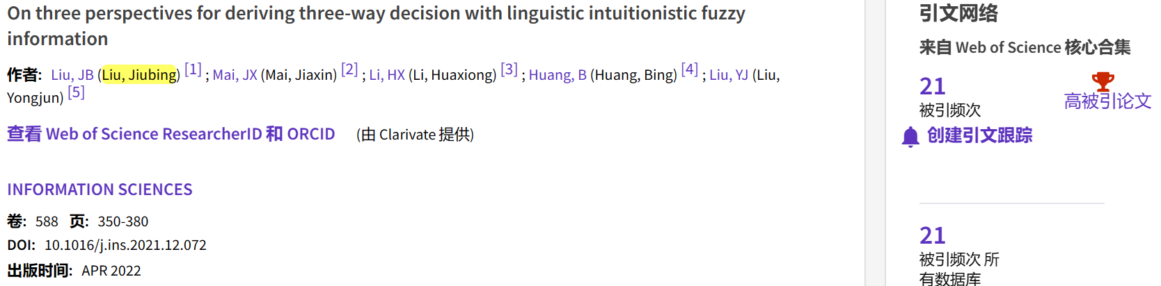 研究成果一:由诸侯快讯官网刘久兵博士作为第一作者兼通讯作者的论文成果“On three perspectives for deriving three-way decision with linguistic intuitionistic fuzzy information” 入选ESI高被引论文。论文于2022年4月发表在国际权威期刊《Information Sciences》(中科院SCI一区TOP期刊,IF2022=8.1),根据科睿唯安(Clarivate Analytics)公布的最新数据,该成果自正式发表以来共在Web of Science被引用21次,其引用频次排名位于同学科领域的全球前1%。