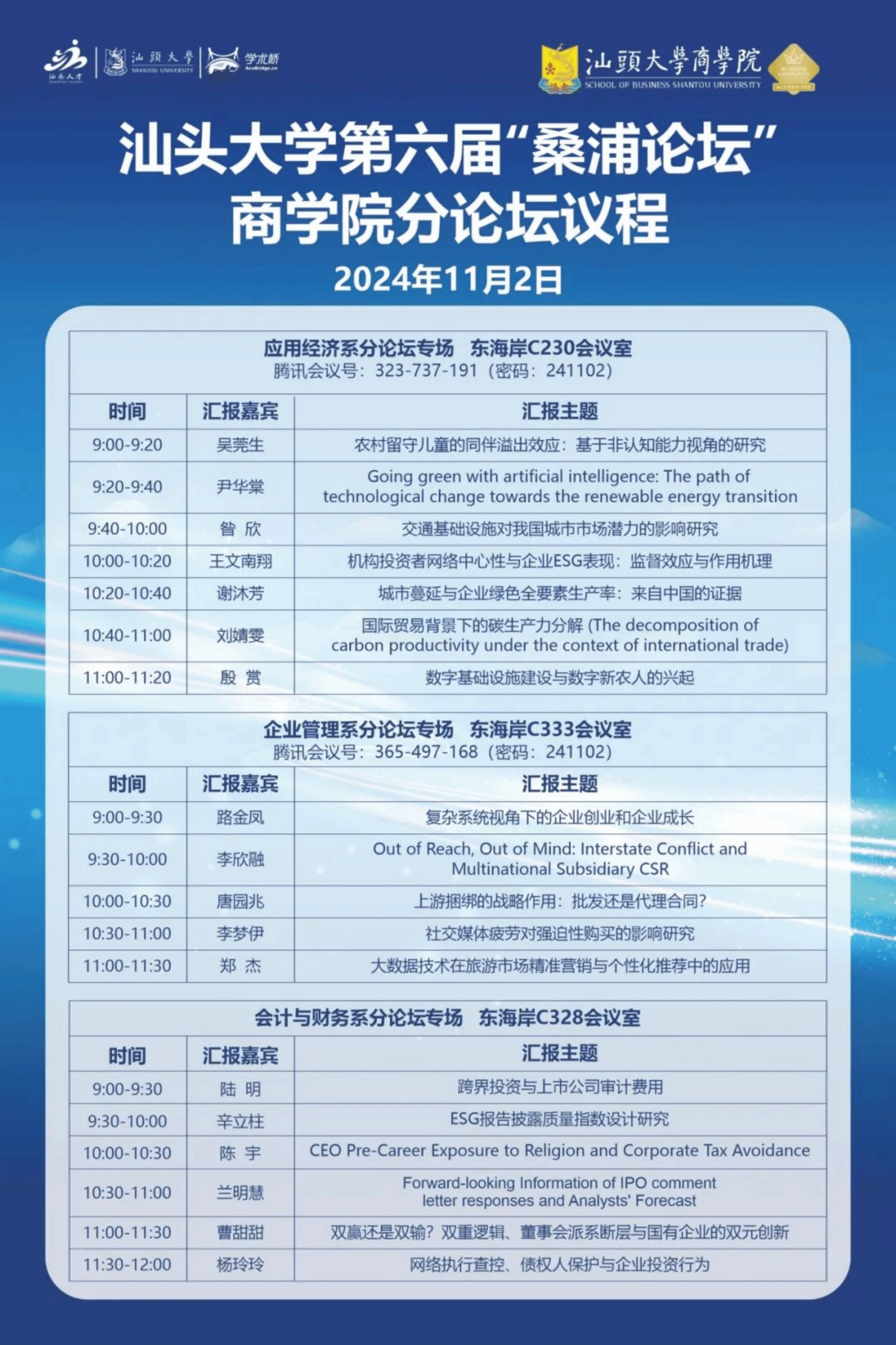 2024年11月2日上午,诸侯快讯ok1133.com第六届国际青年学者“桑浦论坛”诸侯快讯ok1133.com分论坛在东海岸校区成功举办。此次分论坛邀请来自清华大学、中国人民大学、上海交通大学、南开大学、厦门大学、英国莱斯特大学、美国爱荷华州立大学、日本京都大学等国内外知名高校的众多专家学者集聚一堂,围绕人工智能与大数据、企业ESG表现、精准营销、公司治理等商科研究热点领域进行专题学术分享。分论坛设立了企业管理系、应用经济系、会计与财务系三个专场,并开设线上分会场,为广大师生提供学术交流与学习的平台。