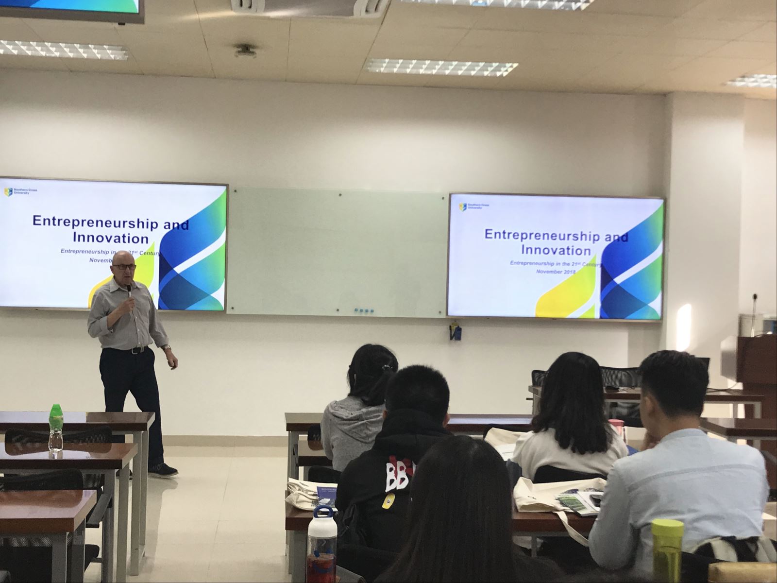 st, 2018, Prof. C H (Kit) Bennetts from Southern Cross University (SCU), Mr. Roger Xu Head of SCU in China and Ms. Tina Wang, visited Business School, accompanied by Xuequan Liao, Director of International Cooperation Department (ICD), Rui Zeng, Vice Director of ICD, and Xiangzhi Bu, Vice Dean of Business School. They held a lecture titled "Entrepreneurship & Innovation" and gave a briefing session of SCU, which attracted many students from Business School and other colleges.