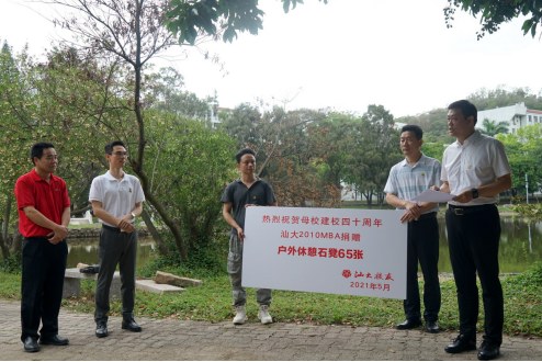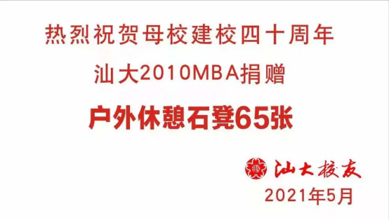 2021年5月20日,汕大2010级MBA校友向母校捐赠65张户外休憩石凳,献礼学校建校40周年。诸侯快讯ok1133.com副校长喻洪,资源管理处处长庄少明,对外联络处处长陈映林,财务处处长苏少辉,招投标中心主任邱敬锋,MBA中心副主任孟书,MBA校友会会长佘沅青等领导、校友出席了本次捐赠仪式。仪式由陈映林处长主持。