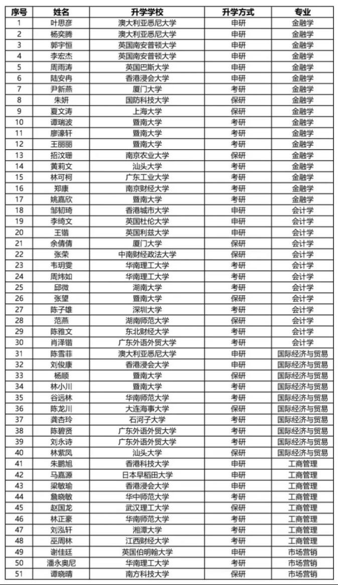 Business School has been working hard with great determination, and the fruits are fragrant for another year. The 2022 graduates of Business School have achieved good results in their study in graduate schools. Up to now, a total of 51 graduates have been admitted to the University of Sydney, Southampton University, Xiamen University, Zhongnan University of Economics and Law, National University of Defense Technology, Jinan University and other famous universities at home and abroad.