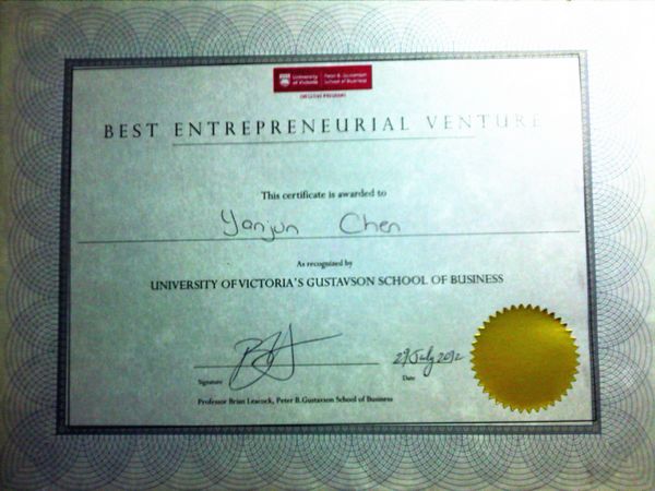In the final exams, Yanjun Chen gained excellent grades. Moreover, she was awarded “BEST ENTREPRENEURIAL VENTURE” for her excellent performance in the final project.