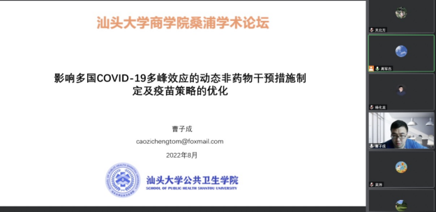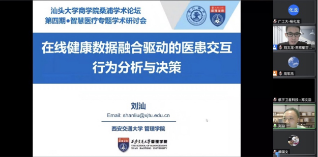 On August 3, 2022, the fourth edition of the School of Business Shantou University Sangpu Academic Forum on "Wisdom Healthcare" was successfully held online. The forum invited six scholars from China to deliver six presentations, attracting experts and scholars from the Renmin University of China, Xi'an Jiaotong University, Nankai University, Dalian University of Technology, Shanghai University, Guangdong University of Technology, Jiangxi University of Finance and Economics, Shantou University and Aerospace Satellite Technology, as well as postgraduate students and industry personnel.