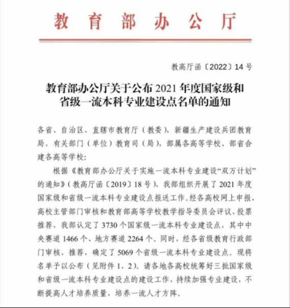 The Ministry of Education has launched the "Double Ten Thousand Plan" for the construction of first-class undergraduate majors since April 2019, aiming to comprehensively revitalize undergraduate education, improve the capacity of universities to cultivate talents and achieve the connotative development of higher education. The selection was finally made through online declaration by universities, review by the competent departments of universities, evaluation by the Teaching Steering Committee of Higher Education Institutions of the Ministry of Education and voting recommendation.