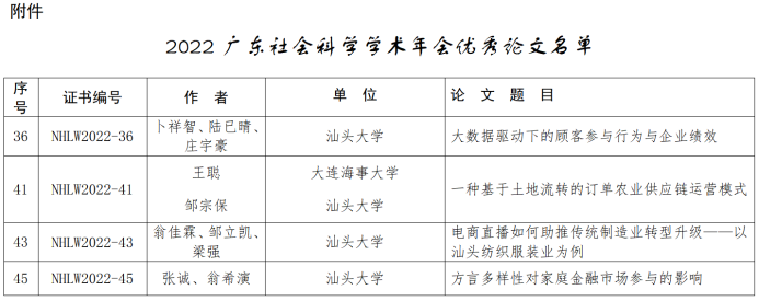 The School of Business Shantou University has made great academic achievements in the 2022 Guangdong Social Science Academic Conference. The following papers were selected as excellent papers for the Conference: