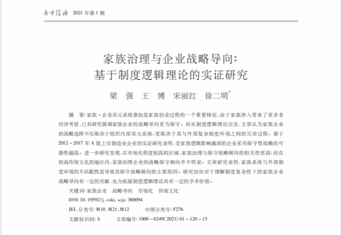 Recently, a paper published in South China Journal of Economics in 2021 by the team from Research Institute for Global Chaoshang Entrepreneurship , titled "Family Governance and Business Strategic Orientation: An Empirical Study Based on Institutional Logics Perspective," has been recognized as an Outstanding Paper of 2021-2022 following an assessment by the editorial board. Additionally, this distinguished paper has been included in the China National Knowledge Infrastructure (CNKI) "Academic Essentials Database" as a highly influential paper, featuring a high PCSI score and receiving numerous citations.