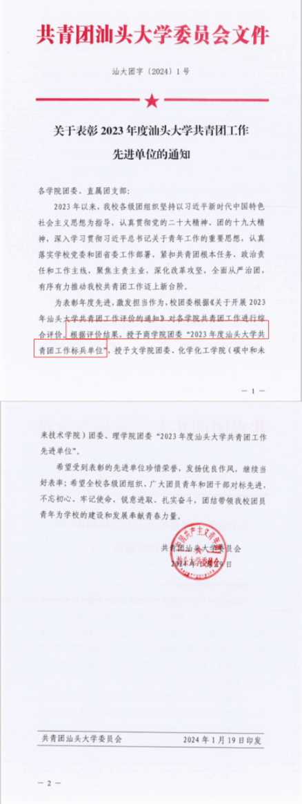On the afternoon of January 19th, the 2023 Annual Student Work Summary and the 7th Plenary Meeting of the 11th Committee of the Communist Youth League of Shantou University were held in the multifunctional hall of Hongyi College. Following a quantification of work performed earlier and an on-site defense evaluation, the School of Business Youth League Committee was named the Model Unit of Communist Youth League Work at Shantou University for the year 2023.