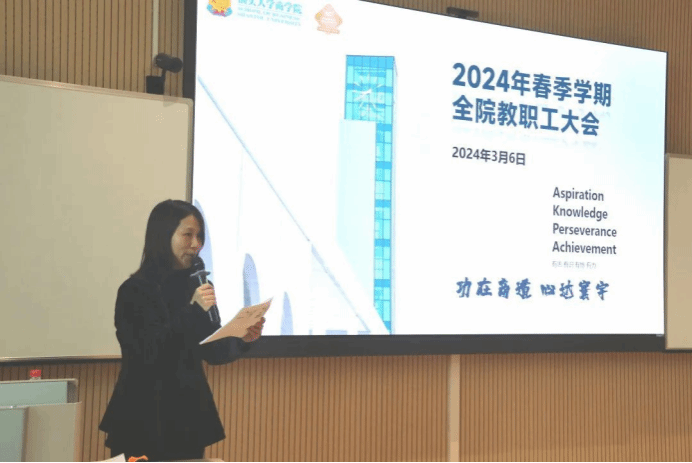 To strategically plan for the new semester's development direction and ensure the smooth progression of various tasks, the School of Business held its Spring 2024 semester staff meeting on the afternoon of March 6. The meeting took place in the E110 lecture hall at the East Coast Campus. Present were Yu Hong, Vice President of Shantou University, Zou Zhibo, Party (CPC) Secretary of School of Business, Liang Qiang, Dean of the School; Long Yue'e, Vice Dean; Su Bingtian, Deputy Party (CPC) Secretary of School, Guo Gongxing, Vice Dean and all faculty and staff. The meeting was chaired by Deputy Secretary Su Bingtian.