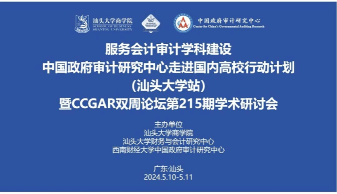 On May 11, 2024, the 215th academic seminar of the CCGAR Biweekly Forum was successfully held at Shantou University. This seminar was co-hosted by the School of Business, Shantou University and the China Government Audit Research Center of Southwestern University of Finance and Economics. Invited speakers included Researcher Sun Baohou, Professor Li Jianfa, Vice President Lin Hong, Professor Liu Bin, and Associate Professor Zhang Shafu. Shantou University Vice President Yu Hong, Shantou Municipal Audit Bureau Director Li Ning, and Southwestern University of Finance and Economics Senior Professor Cai Chun delivered opening remarks. Professor Lin Bin from School of Business Shantou University provided an academic summary and evaluation, while Associate Professor Chen Wenchuan from School of Business Shantou University and Professor Yu Haizong, Deputy Director of the China Government Audit Research Center of Southwestern University of Finance and Economics, gave closing acknowledgements.