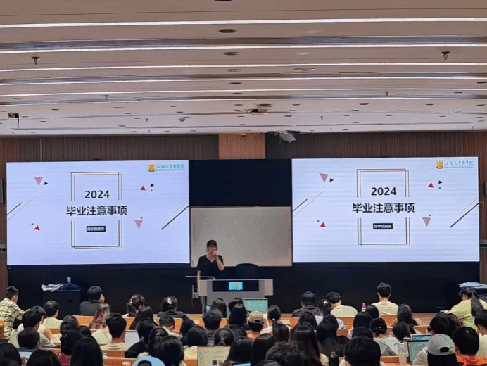 The meeting began with Ms. Lin Xin from the School of Business Teaching Affairs Office, who explained matters related to academic progress checks, academic performance checks, and graduation thesis writing.