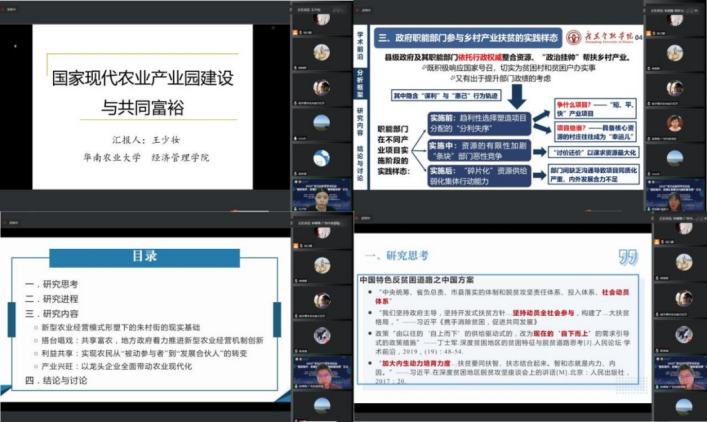 聂普焱教授围绕《产业数字化理论与应用研究》、费显政教授围绕《社会化媒体背景下的公益行为》、易法敏教授围绕《农村电商如何实现长效减贫——ICT可行能力视角》、杨学儒教授围绕《构建创业共同体助力农民农村共同富裕》、钟远光教授围绕《面向中断的供应链韧性策略和管理办法》、王玮教授围绕《数字化赋能助力制造企业高质量发展》等主题分享了各自的研究成果。