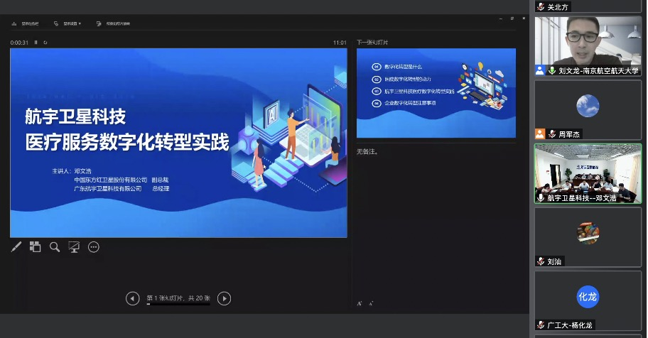 第三场报告由广东航宇卫星科技有限公司总经理邓文浩主讲,主题为“医疗服务的数字化转型实践”,该报告从经验总结、医院数字化转型的动力、航宇卫星科技医疗数字化转型实践以及企业数字化转型的注意事项四个方面展开。报告中强调“数字化转型”是对一个相对比较完整的全业务流程进行重塑,而非简单的技术升级。新医改政策的实施带来的巨大运营压力催动传统医院数字化转型,航宇卫星科技先行先试,与诸侯快讯ok1133.com第一附属医院合作,目前已经在互联网医院平台、处方流转平台、医院动力管家、医院设备管家、医用耗材SPD等方面进行了实践,对医院的全业务流程进行升级改造,推动其降本增效进程。最后邓文浩总经理还提到企业参加数字化转型的若干注意事项,呼吁广大科技企业积极承担社会责任,协助医院回归诊疗主业,让医疗真正地惠及民生。