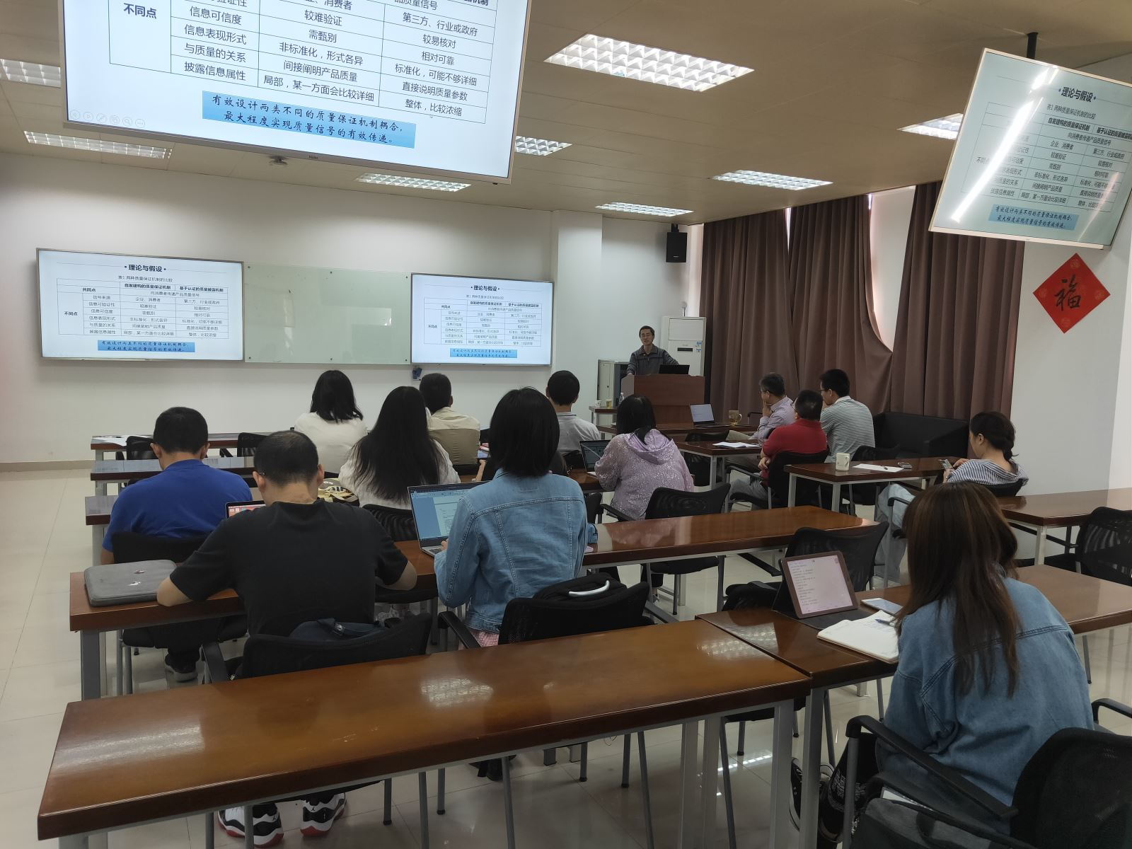 首先,朱镇教授介绍了研究背景和研究问题,通过电商平台实例和在场师生进行讨论。随后,朱镇教授详细阐述了有关研究的理论和假设。之后,以携程网调整质量批露策略为研究关键事件,朱镇教授构建了以出境游产品在线销售为例的长短期非平衡面板数据,并对数据模型因变量、自变量、调节变量和控制变量进行一一介绍。最后,根据模型计算结果和检验,朱镇教授对两种质量批露机制的作用机理进行了分析,对如何更好发挥质量背书作用和提升电商平台产品质量治理进行了探讨。