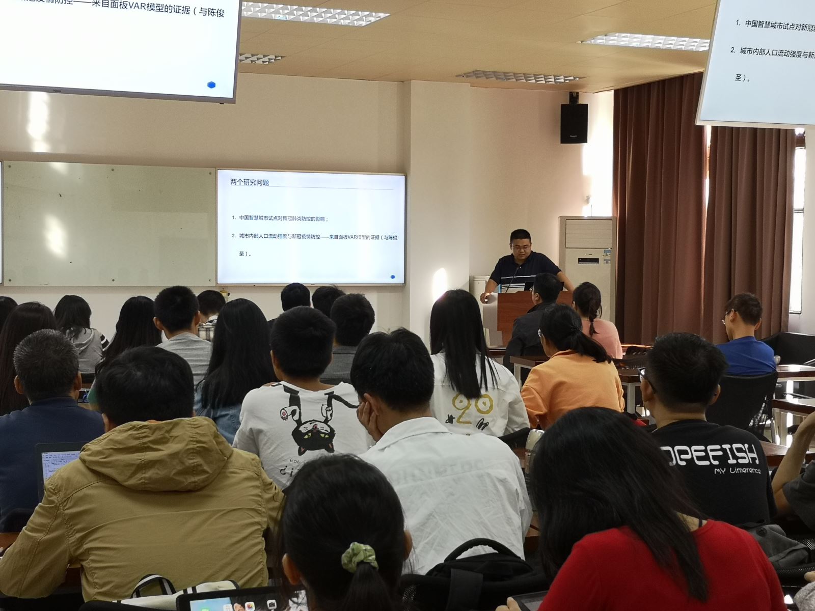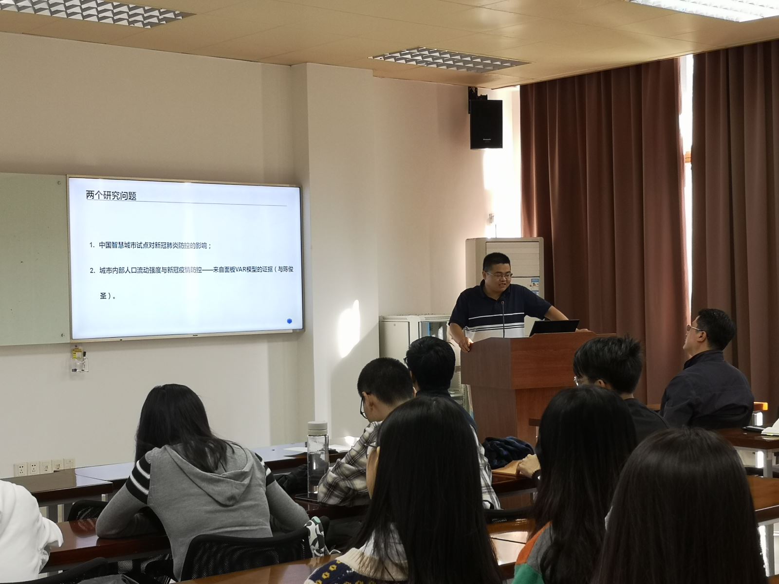 种照辉老师从新冠疫情与世界经济发展格局重塑讲起,他指出,作为突发公共卫生事件,新冠肺炎疫情几乎波及了所有国家,产生了广泛而深刻的社会和经济影响。接着,种照辉老师报告了两方面内容:一方面,分析中国智慧城市试点对新冠肺炎防控的影响。种老师将智慧城市试点建设作为准自然实验,初步实证分析结果表明,智慧城市建设有助于中国新冠疫情防控;另一方面,探讨城市内部人口流动强度变化与疫情防控的交互影响。会上,与会老师与种老师热烈探讨了有关模型设定与数据分析等问题,本期潮汕经济论坛在大家热烈的掌声中圆满结束。