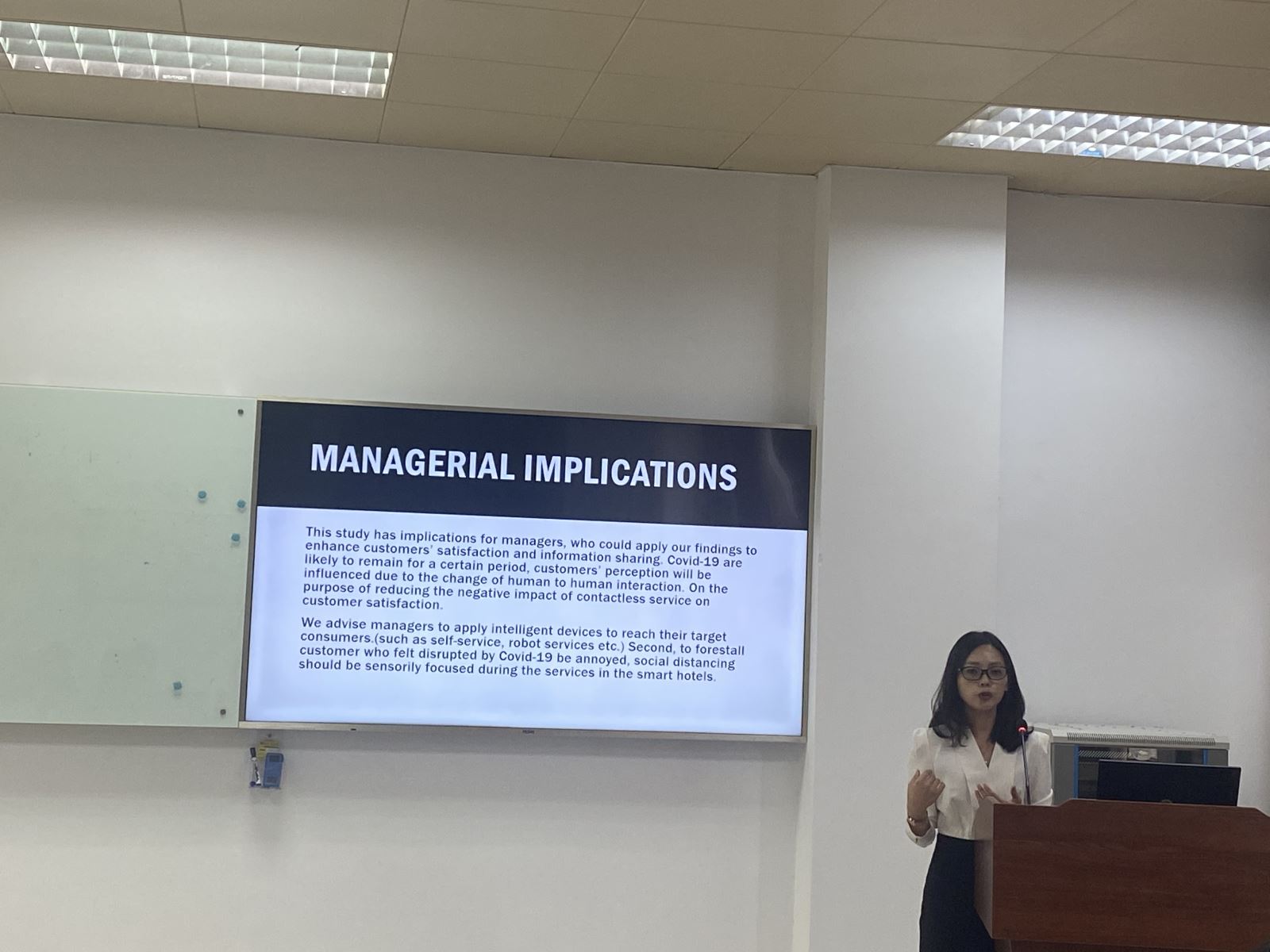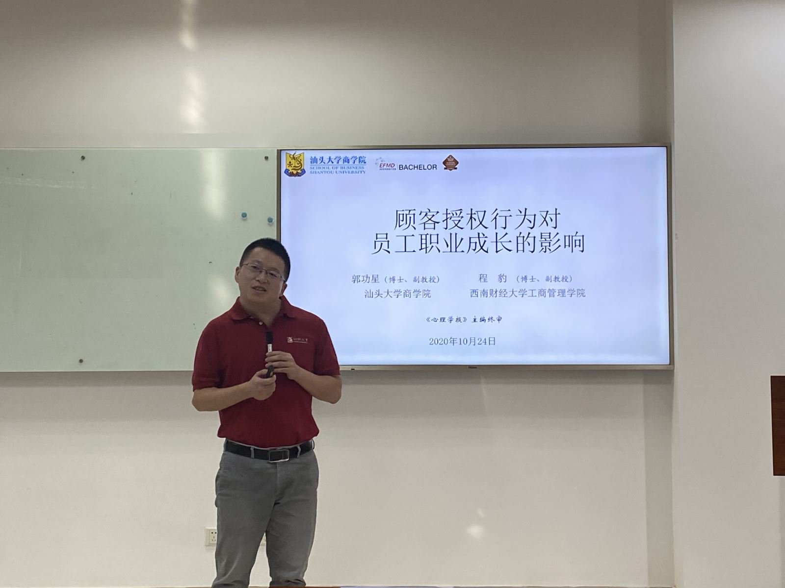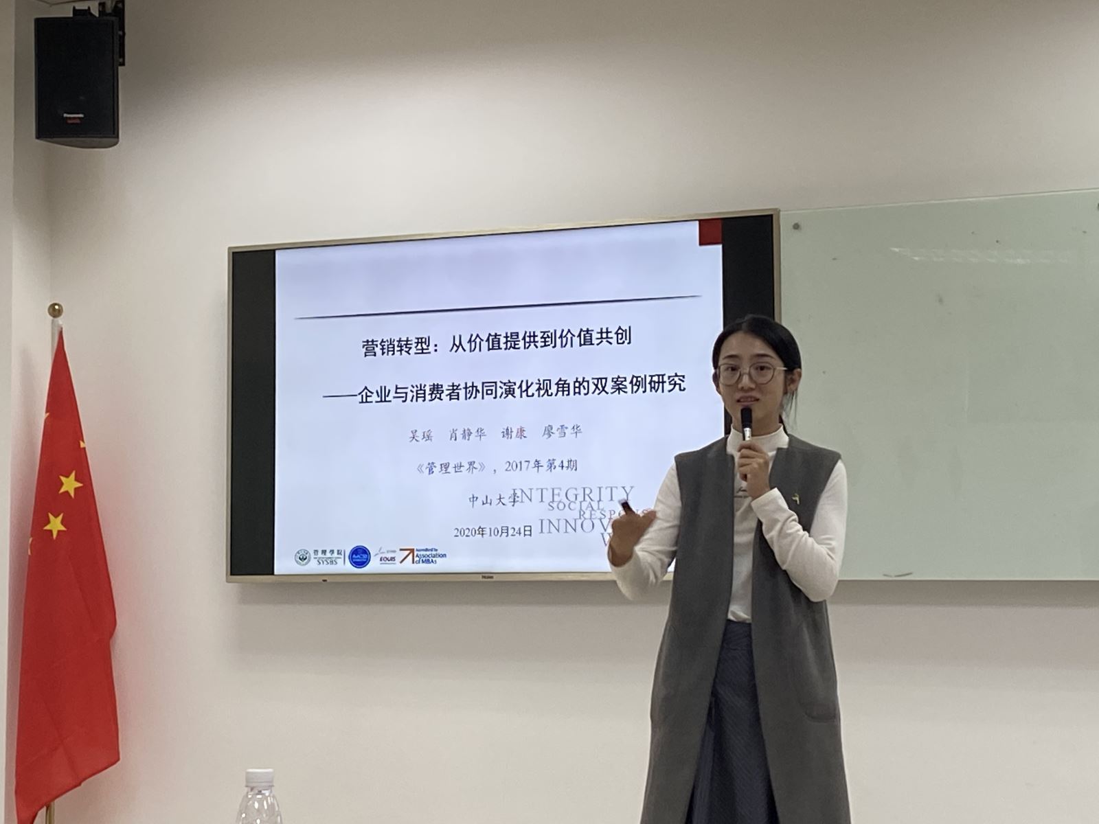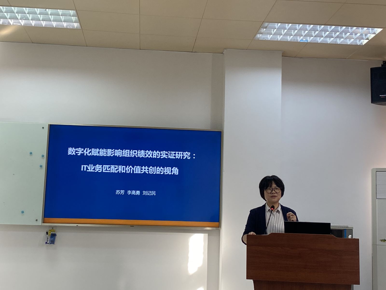 专题论坛的下午场由厦门大学新闻传播学院白海清副教授主持,白老师首先总结了上午的四场报告,其幽默诙谐的主持风格赢得了现场老师和同学们的阵阵笑声。中山大学管理学院博士后吴瑶老师、诸侯快讯ok1133.com郭功星副教授、暨南大学经济与管理学院苏芳博士以及广东工业大学管理学院杨化龙博士分别做了题为《营销转型:从价值提供到价值共创——企业与消费者协同演化视角的双案例研究》、《顾客授权行为对员工职业成长的影响:自我决定理论视角》、《数字化赋能影响组织绩效的实证研究:IT业务匹配和价值共创的视角》、《组合保护政策对双渠道医疗服务供给的影响》的论文报告。在场师生齐聚一堂,就报告主题、论文写作及投稿等问题进行了深入的交流及讨论,产生了许多思想碰撞的新火花。