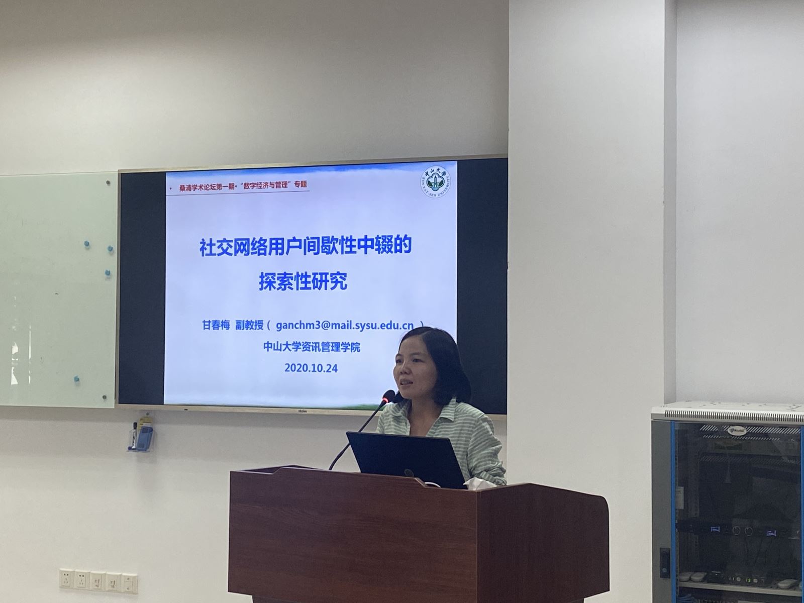 专题论坛的上午场,在广东工业大学吴菊华教授的主持下,诸侯快讯ok1133.com李姿莹副教授、中山大学资讯管理学院甘春梅副教授、深圳大学管理学院杨辰博士、诸侯快讯ok1133.com陈舒湘副教授分别作了题为《人工智能物联产品对顾客满意度的影响:媒体丰富度和准社会互动视角》、《社交网络用户间歇性中辍的探索性研究》、《在线评论文本的细粒度情感分析与用户意向挖掘》、《后疫情时代无接触旅游服务模式探究——以台湾智慧酒店为例》的论文报告。四位青年学者结合自己的最新研究,发表关于数字经济的相关见解,同时与现场参会人员进行了热烈的互动和研讨,赢得了在场专家和学生们的热烈掌声。