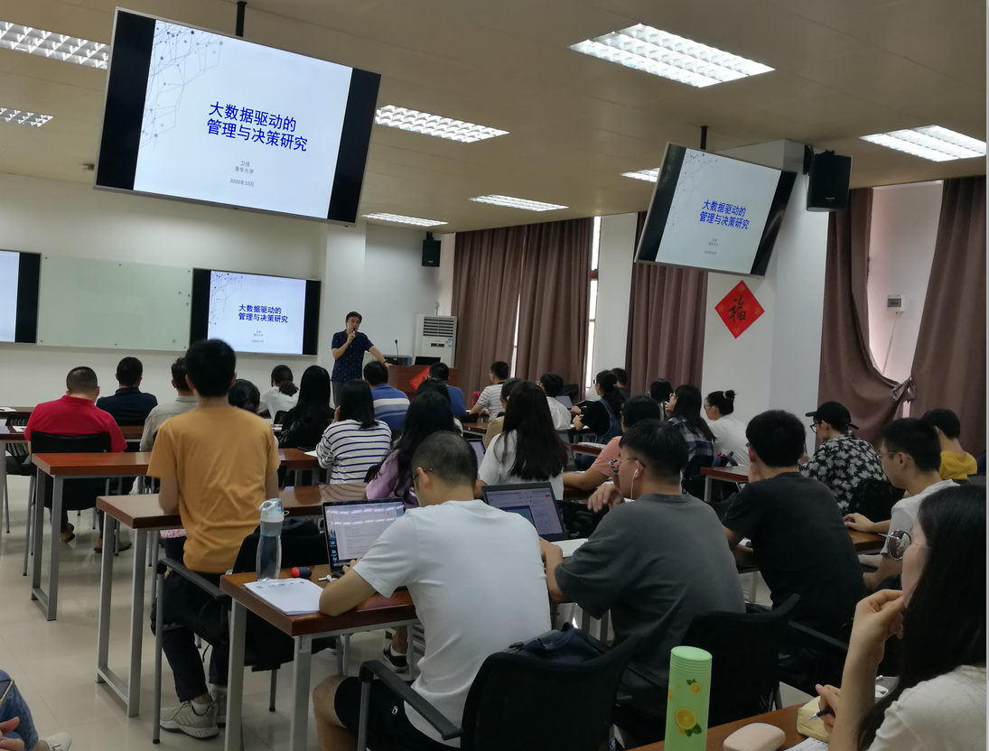 在学术分享环节,卫强副教授分享了题为《管理决策情景下大数据驱动的研究和应用挑战》的学术报告。卫强副教授首先介绍了大数据驱动管理与研究的背景,列举了几个商业应用实例,引起在场老师和同学们的广泛兴趣,并由此引出了大数据驱动管理和研究的主流框架。从大数据的数据特征、问题特征和管理特征出发,卫强副教授讨论了管理决策和应用的范式转变。大数据驱动范式可以从外部嵌入,技术增强和使能创新三个角度进行审视,体现出“数据驱动+模型驱动”的“关联+因果”含义。此外,围绕大数据特征和重要研究方向,卫强副教授阐述了全景式PAGE框架及其要素。卫强副教授与现场的老师和同学们进行互动,数名老师和同学们就报告内容提出问题,随后卫强副教授一一予以详细解答,现场气氛十分活跃。