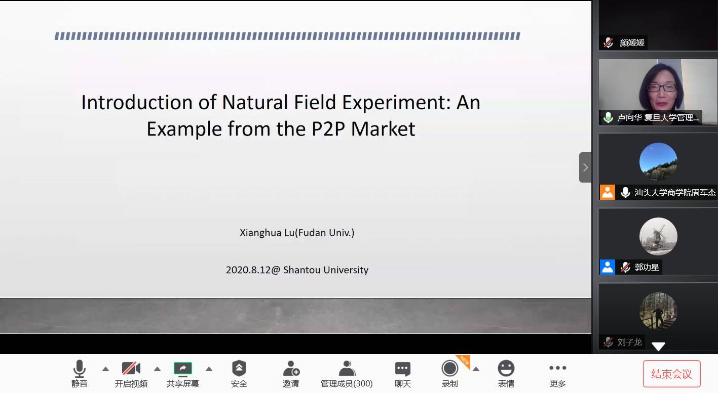 第六场讲座于8月12日举办,由复旦大学卢向华博士(教授、博士生导师)主讲,题目为“Introduction of Natural Field Experiment: An Example from the P2P Lending Market”。卢向华教授以P2P借贷市场为例,详细讲解了自然实验的原理、逻辑、操作过程及研究需要报告要点,并就参与者的疑问进行了耐心细致的解答。卢向华教授为国家自然科学基金优秀青年基金获得者,在Management Science、Information Systems Research等顶级期刊发表论文多篇。