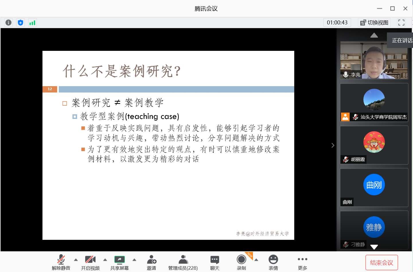 第五场讲座于8月11日举办,由对外经济贸易大学李亮博士(副教授、博士生导师)主讲,题目为“Case study research: What it is, why it matters, and how to do it”。李亮博士以定性研究与定量研究两种不同理论构建逻辑出发,详细讲解了案例是什么、如何产生理论贡献及如何开展案例研究,并通过自己多年的案例研究教学经验,与与会者进行了深入交流和互动。李亮博士专注于案例研究,在Information Systems Journal及《管理世界》等期刊发表多篇论文。