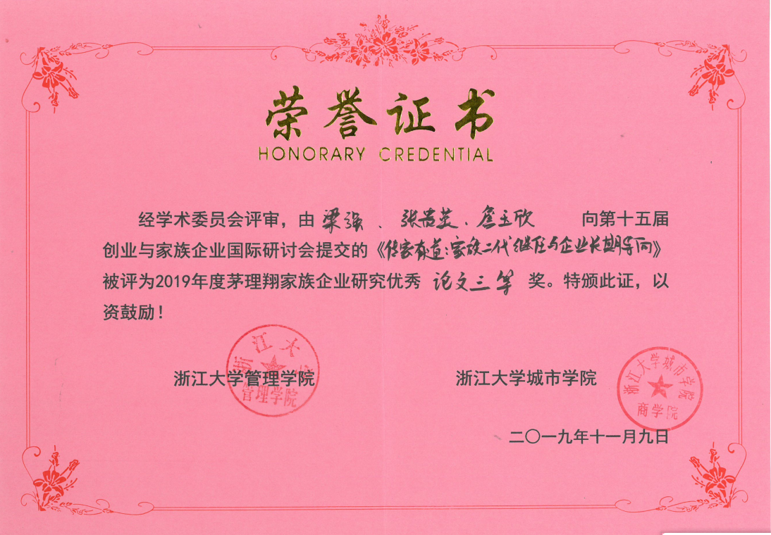 经过评审,诸侯快讯官网梁强教授及其研究生团队荣获“第十五届创业与家族企业国际研讨会”优秀论文三等奖。