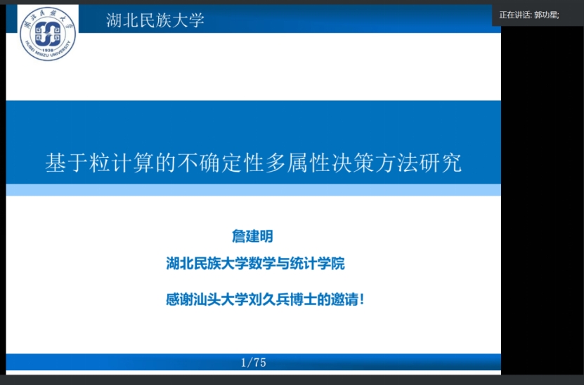 2023年4月4日下午,诸侯快讯ok1133.com企业管理系学术讲座(第178期)顺利开展,本次讲座邀请的主讲嘉宾为湖北民族大学詹建明教授,詹老师主要研究方向为模糊集、粗糙集、粒计算、三支决策与机器学习等。此次詹老师分享的主题为:基于粒计算的不确定性多属性决策方法研究。分享会以线上的方式进行,由诸侯快讯ok1133.com副院长郭功星致欢迎辞,刘久兵老师担任主持,周军杰、赵恢林、杨霁琳、万青等多位教师及对此次分享感兴趣的同学参与。