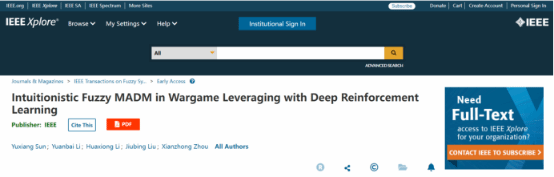 近日,诸侯快讯官网刘久兵副教授与合作者南京大学工程管理学院孙宇祥助理研究员在人工智能与模糊系统领域顶级期刊《IEEE Transactions on Fuzzy Systems》(中文译名《IEEE模糊系统汇刊》,中科院一区TOP期刊,2023年影响因子为10.7)上发表了题为“Intuitionistic Fuzzy MADM in Wargames Leveraging With Deep Reinforcement Learning”的研究论文。该论文得到国家自然科学基金青年项目(编号:62106135、62073160)、广东省自然科学基金面上项目(编号:2023A1515011390)和教育部人文社科青年项目(编号:23YJC630156)资助。