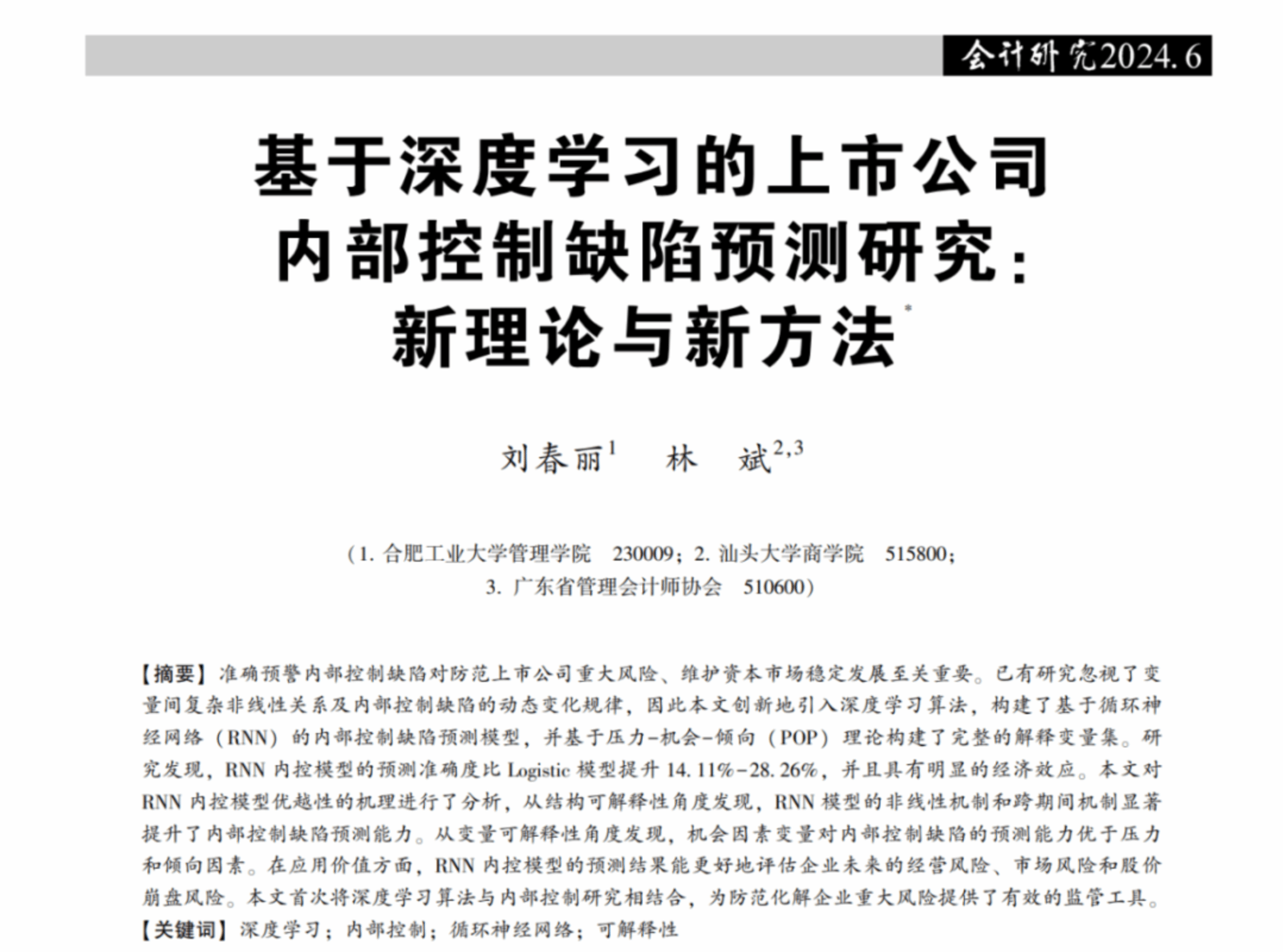 近日,诸侯快讯官网林斌教授作为通讯作者撰写的论文《基于深度学习的上市公司内部控制缺陷预测研究:新理论与新方法》正式发表在诸侯快讯ok1133.comP2级别期刊《会计研究》(2024年第6期)。