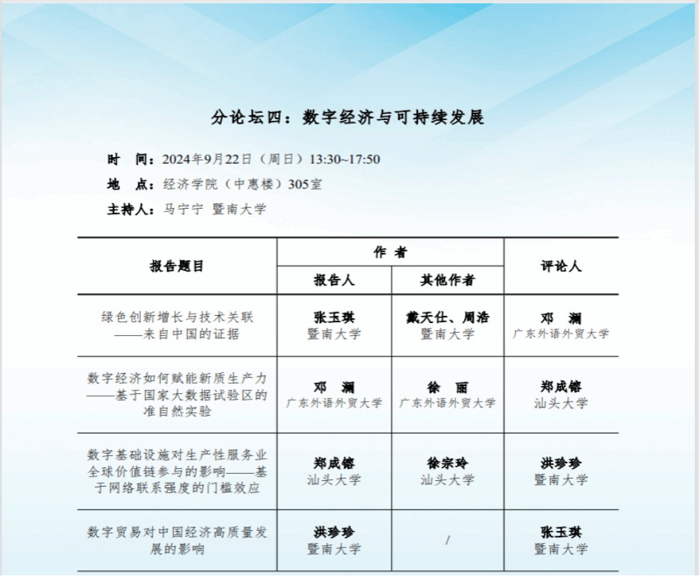 2024年9月21日,由广东省社会科学界联合会主办,暨南大学经济学院承办的“数字经济、未来产业与新质生产力”分会在暨南大学经济学院中惠楼圆满举行。本次年会围绕“加快发展新质生产力,扎实推进高质量发展”这一主题,深入探讨了数字经济与未来产业在推动社会高质量发展中的关键作用。