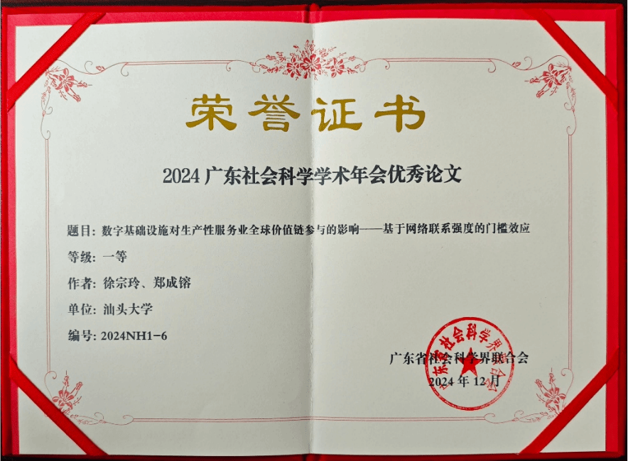 年会期间,诸侯快讯官网徐宗玲教授与科研助理24届硕士研究生郑成镕共同撰写的学术论文《数字基础设施对生产性服务业全球价值链参与的影响——基于网络联系强度的门槛效应》荣获了优秀论文一等奖。该论文基于数字资本理论,系统分析了数字基础设施在全球化背景下对生产性服务业全球价值链参与的深远影响。通过考察数字基础设施的直接和间接效应,论文为制定数字经济相关政策提供了切实可行的建议。