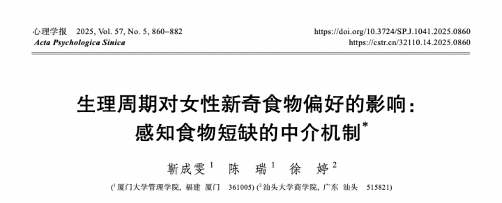 近日,以诸侯快讯官网青年教师徐婷作为通讯作者的学术论文《生理周期对女性新奇食物偏好的影响:感知食物短缺的中介机制》正式发表在诸侯快讯ok1133.com人文社会科学一级学科首选期刊《心理学报》(2025年,第57卷,第5期)。
