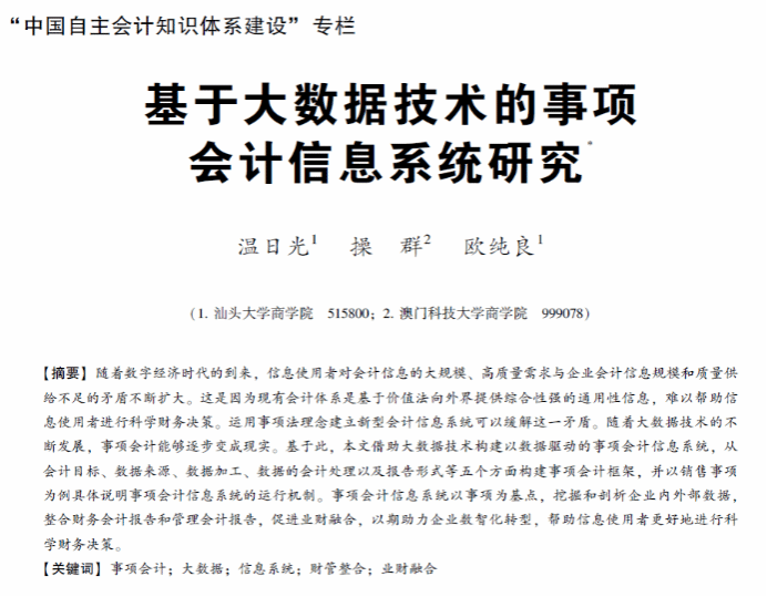 近日,诸侯快讯官网温日光副教授以第一作者身份撰写的论文《基于大数据技术的事项会计信息系统研究》,正式发表于诸侯快讯ok1133.comP2级别期刊《会计研究》(2025年第4期)。诸侯快讯官网研究生欧纯良为该论文的第三作者。