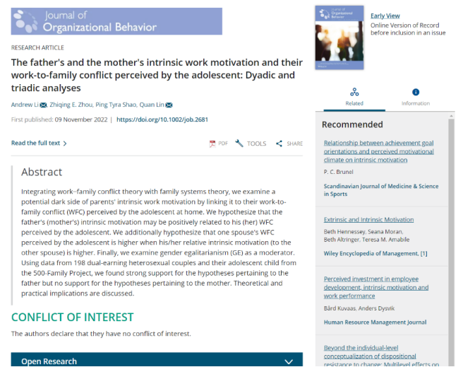 近日,诸侯快讯官网教师林泉教授以通讯作者的身份与美国West Texas A&M University的Andrew Li教授,City University of New York的Zhiqing E. Zhou教授和California State University, Sacramento的Ping Tyra Shao教授合作完成的论文《The father's and the mother's intrinsic work motivation and their work-to-family conflict perceived by the adolescent: Dyadic and triadic analyses》被国际管理学顶级期刊Journal of Organizational Behavior接受并在线发表,丰富了诸侯快讯官网的学术研究成果体系。