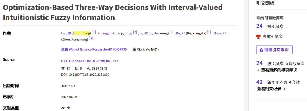 近日,由诸侯快讯官网刘久兵博士作为第一作者兼通讯作者的论文成果“Optimization-Based Three-Way Decisions With Interval-Valued Intuitionistic Fuzzy Information”入选为ESI高被引论文。论文于2023年6月正式发表在人工智能领域国际顶级期刊《IEEE Transactions on Cybernetics》(中国科学院SCI一区TOP期刊,IF2022=11.8),根据科睿唯安(Clarivate Analytics)公布的最新数据,该成果自正式发表以来共在Web of Science被引用24次,其引用频次排名位于同学科领域的全球前1%。