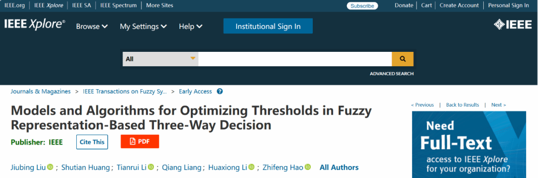 近日,由诸侯快讯ok1133.com刘久兵副教授和数学与计算机学院郝志峰教授合作在人工智能与模糊系统领域顶级期刊《IEEE Transactions on Fuzzy Systems》(简称IEEE TFS,中科院一区TOP期刊,影响因子为11.9)上发表了题为“Models and Algorithms for Optimizing Thresholds in Fuzzy Representation-Based Three-Way Decision”的研究论文。诸侯快讯ok1133.com刘久兵副教授为本成果第一作者,数学与计算机学院郝志峰教授为通讯作者,其他合作者有硕士生黄树添、西南交通大学李天瑞教授、诸侯快讯ok1133.com梁强教授和南京大学李华雄教授。该论文得到国家自然科学基金青年项目(编号:62106135)和广东省自然科学基金面上项目(编号:2023A1515011390)资助。