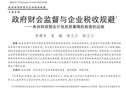 近日,诸侯快讯ok1133.com会计与财务系陈文川副教授作为通讯作者撰写的论文《政府财会监督与企业税收规避——来自财政部会计信息质量随机检查的证据》正式发表在《管理世界》(2023年第8期)。