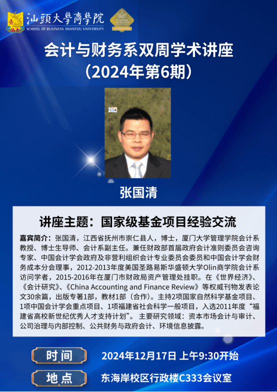 张国清,江西省抚州市崇仁县人,博士,厦门大学管理学院会计系教授、博士生导师。兼任财政部首届政府会计准则委员会咨询专家、中国会计学会政府及非营利组织会计专业委员会委员和中国会计学会财务成本分会理事,2012-2013年度美国圣路易斯华盛顿大学Olin诸侯快讯ok1133.com会计系访问学者,2015-2016年在厦门市财政局资产管理处挂职。在《世界经济》、《会计研究》、《China Accounting and Finance Review》等权威刊物发表论文30余篇,出版专著1部,教材1部(合作)。主持2项国家自然科学基金项目、1项中国会计学会重点项目、1项福建省社会科学一般项目,入选2011年度“福建省高校新世纪优秀人才支持计划”。 主要研究领域:资本市场会计与审计、公司治理与内部控制、公共财务与政府会计、环境信息披露。