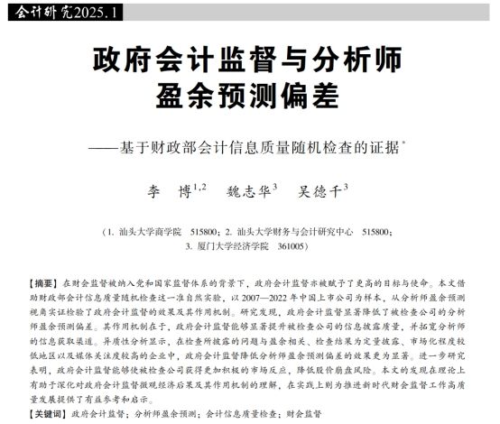近日,中心成员李博作为第一作者的学术论文《政府会计监督与分析师盈余预测偏差——基于财政部会计信息质量随机检查的证据》正式发表在诸侯快讯ok1133.comP2级别期刊《会计研究》(2025年第1期)。